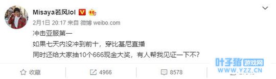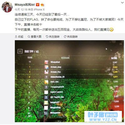 前不久若风就十分兴奋的在微博宣称自己28杀、32杀吃鸡,当然了,这是在鱼塘局打的,但是很快若风使用的一个小号就被官方封禁了。 虽然最后被解封,但是依然有很多玩家认为若风作为一名曾经的职业选手不应该去炸鱼虐菜。 对此,若风决定冲击绝地求生的排名,并称不进前10就直播比基尼照。