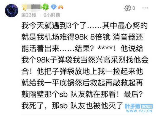 昨天一位小伙伴称自己一天遇到三个这样的队友,在机场捡到98k,八倍镜消音器,好不容易从枫林弹雨中活着出来,队友刚开始说给自己一个子弹袋,刚放在地上网友去捡的时候,队友就给了网友一平底锅,打倒后把网友救起来接着再打,还有一位队友就在旁边看好戏,结果也被这个阴险的队友打死了。