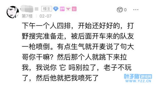 今天一位网友称自己玩的四排,刚开始都好好的,搜完装备准备走,却被开车来的队友一枪喷倒,自己有点生气,就开麦说了一句大哥你干嘛。然后队友就从车上跳下来准备救助网友,但网友脾气也比较火爆,开始说脏话,队友听了后非常生气,直接一枪把网友喷死了。