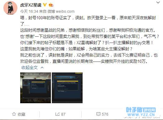 虎牙XZ星魂吃鸡账号解封,豪言:实锤我开外挂的奖励10万