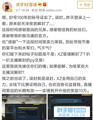 2月7日上午,斗鱼的一名超管在微博爆料,虎牙会帮助星魂洗白,并联系蓝洞公司解封。当天下午,星魂发微博已经解封。这里边视乎有很多不可告人的秘密和交易。