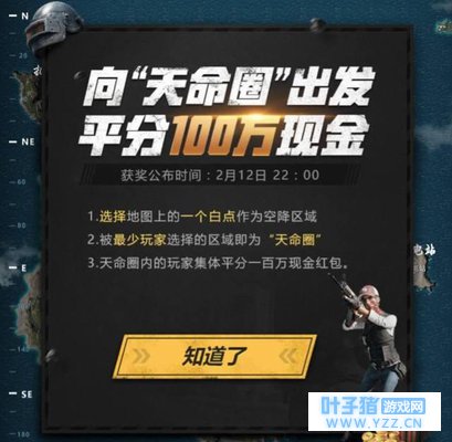 这个活动真的很有意思的,因为这个地图是已经汉化了的,也就是说我们以后看到的国服地图就是这样的,然后选择一个天命圈,就可以进行降落了,一般在游戏中天命圈都是刷在一些人少的地方,完全就是靠运气的,所以这次国服的绝地求生也和大家来了一波运气测试,看看哪些有缘人能够获得百万奖金,时间持续5天,在2月12号22点开奖,估计那时候国服的消息应该出来了。