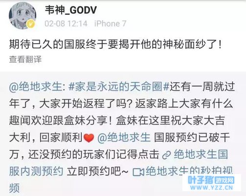 虽然国服上线前景并不明朗,但是韦神发微博称:期待已久的国服终于要揭开他的神秘面纱了。这难不成是暗示国服即将上线吗?现在距离过年只有大约一个星期,要是国服真的能在年前上线,绝对是吃鸡玩家们最乐于见到的新年礼物。