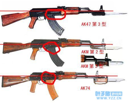AK系列主要有AK47、AKM、AKMS、AK74等等今天吃鸡哥主要给大家分享一下他们的区别。 (吃鸡哥顺便科普一下在枪械中,S指折叠金属托,M指现代化版本 ) 如何从外形上区分AK47、AKM、AK74? 1、 AK47枪口没有什么消焰、制退器。 AKM则有个斜口防跳器,但AKM第二型则没有。 AK74枪口有一个圆形消焰器。 2、 AK47枪托和枪身不在一条直线上 AKM、AK74则是一条直线 3、 枪身弹夹口上方,机匣下方:AK74是方形,AKM、AK74是圆形