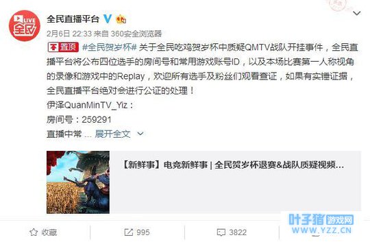 2月6日晚间进行的全民吃鸡贺岁杯上,QMTV主播队一系列逆天操作引起了数支参赛队伍的质疑,最后多支战队以退赛的形式表达了自己的抗议和不满,当天的总决赛也因为这个突发事件被迫中止。相关视频发布至网上后瞬间引起了网友的激烈讨论,各大游戏论坛绝地求生版面被铺天盖地的讨论帖覆盖。