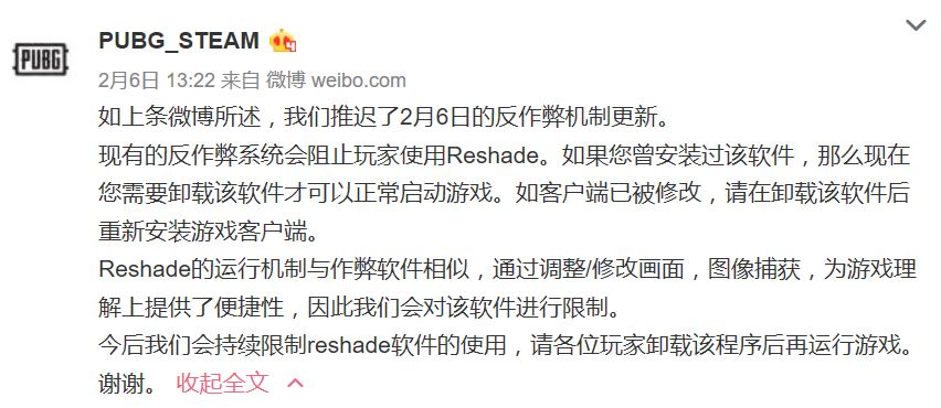 反作弊更新 随后官方微博表示reshade被禁止使用