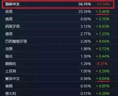 但是当steam将一月份硬件和软件的调查结果发布出来的时候,虽然使用简体中文的用户还在第一位,但对比上个月,steam的中文用户下降了13.14%,(这个数字好吉利),而使用英语的用户增加了5.46%,使用繁体中文的用户增加了0.04%。