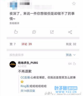 于是官博的作用就出来了,当玩家们总是意外地进不去游戏组不了队,只要去官博看一眼有没有道歉,就知道究竟是自己卡了还是服务器炸了。而官博的道歉甚至比正常发文还频繁! 就连官博自己都拿“道歉”梗自黑了,在一次微博互动中,关于“你想做却做不了的事”的回答,绝地求生官博竟然吐槽说:“不再道歉。”