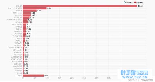 国内“吃鸡”游戏分流一直以来,中国玩家一直是《绝地求生》国际服的主力,国内玩家数占比达到了46.59%,而排名第二的美国仅占9.71%。
