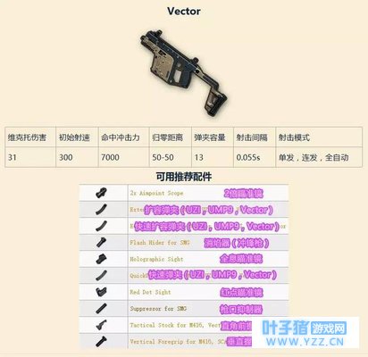vector配件 根据许多玩家的经验,其实玩Vector并不依赖瞄准镜,因为能派他上场的时候,只有在近战,甚至贴脸情况下,因此没有基础镜即使用机瞄或者肩射也十分带劲,有时候开镜反而感觉不顺手。至于高倍镜,那就更不用说了,跟Vector完全没有任何关系。