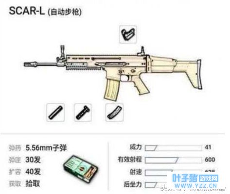scar作为绝地求生里除了m16外最容易获得的全自动步枪,子弹:5.56,扩容后40发子弹,跟M4威力跟射程极为相近,虽然射速较M4低,但这把枪使用起来相对稳定。