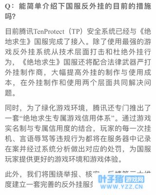 直接总结一下TX的反外挂措施公布内容: 1. 不管是已知还是未知的外挂,在系统每5分钟的实时查证和每1小时的回溯查证双重查证下都将无从遁形。 2. 对于那些屡罚不改,破坏游戏环境的玩家,反外挂系统将锁定其违规行为的硬件设备,处以该违规机器再也无法登入游戏的处罚。 3. 新增一键录制功能和视频举报功能,给你们有仇报仇的机会! 4. 除了监测外挂和封号,还会从源头下手,去年破获了外挂案件30起,抓获犯罪嫌疑人120余人。
