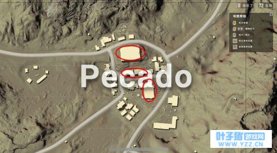 之后是机场,机场的关键争抢点在于机场的几个建筑,油条、C字楼、警察局,还有K字楼,这几个地方都非常热门,里面的资源众多,而且也是练习对枪技巧的好地方,有各种掩体可供玩家使用,比起学校的室内战斗还是好不少的。比较常见的打法是落在C字楼的楼顶,例如北楼和南楼,就算没捡到枪也还能跳下楼。其次是警察局和K字楼,属于竞争非常激烈的地点,能不能走出去完全是看运气了,在这种地方没有枪基本上是凉了。而油条则是一个风险比较大的地方,因为没有好的掩体,容易被C字楼那里的人发现并集火,但油条上的物资也不差,高级物资概率极高,还是值得一去的。 沙漠地图—pecado