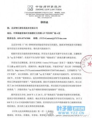 最近整个游戏市场都是被吃鸡的热度霸占了,可以说无论是手游还是端游,到处都是一片鸡味,很灵性!伴随着吃鸡的大火,有这么一个东西也是火了起来,那就是外挂所引发的律师函。无论是之前55开的节奏还是其他的各种节奏,律师函这三个字算是一次次的出现在了网友们的眼前,就很神奇。 这不,近日虎牙直播王牌吃鸡主播之一的也是分分钟就来了一纸律师函,而且这个律师函可是送给大佬媒体的哦,这波一言不合就送律师函的操作,网友也是佩服的不行,直言:天秀!