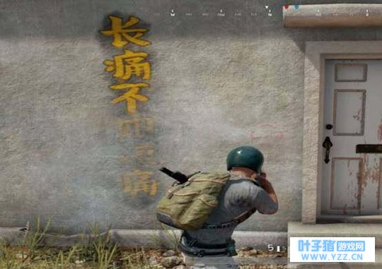 2、大家在吃鸡游戏里除了神仙之外,最痛恨的就是老阴比了。他们躲在草丛中,当你好不容易进了决赛圈,小心翼翼,时不时左顾右盼,深怕被敌人发现的时候,突然你就被一个穿着吉利服的老阴比给杀了,当时恐怕心态爆炸,恨不得顺着网线去打死他。有玩家在一面墙上发现了一句话”长痛不如短痛”,可以说对当时的感觉是很真实的了。