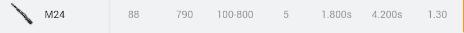 从上图可以看出,M24无论是伤害还是射程亦或是子弹初速的表现都非常的不错,都仅仅比AWM差一点,但是由于AWM的子弹特殊性所以M24要比AWM要受欢迎的多。