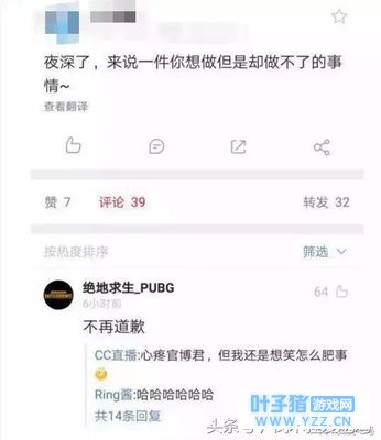 当玩家们的游戏出现错误时,只要去官方微博看一眼有没有道歉,就知道是否是自己的网络卡了还是服务器的问题。也正是因为如此官博的道歉一拉下来几乎是满满一屏幕,比起正文可以说是10比1的比例了。有时常会听见“吃鸡官博今天道歉了吗?”或“在网吧玩突然游戏卡了,大家都在看手机,肯定是官博又道歉了”等等,甚至还有玩家调侃,”要是每个家庭都有一个这么会道歉的人,哪还能出现那么多家庭纠纷。”