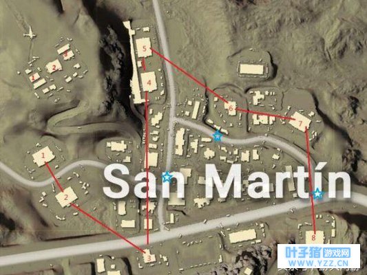 El Pozo深井镇,位于沙漠地图的西侧,是一个降落人数不多的好地方。如图中红色箭头所示,角斗场、拳击场、烂尾楼这样走下来,就能搜齐前期的所有装备。组排模式下,建议直接从中部的两个角斗场入手,拿下之后再向四面八方扩散。 San Martin