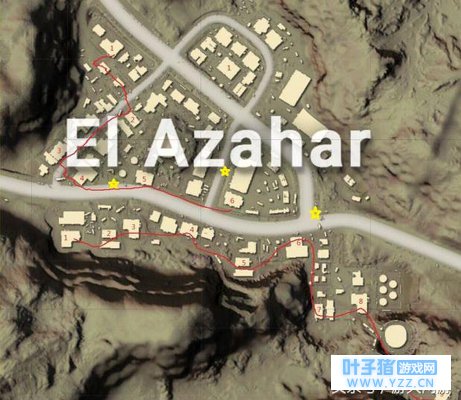 圣马丁位于地图中央、豪宅西侧,这里的人相对来说会更多一些,但是大型的房屋也不少,如果按照图中1-8的路线走下来,整队人都能拿到一套装备。单排的话推荐大家直接跳4和5这两个仓库,或者6和7,小小的一片区就能赋予你充足的战斗力。 El Azahar
