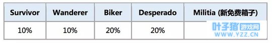 除此之外,这款免费箱子MILITIA,就会和目前游戏中上线的4款箱子一起随机性获得,游戏玩家可以免费开启这个箱子获得饰品。下图是获得各款免费箱子的概率。可以看到,这款新箱子获取率高达40%,只要你不脸黑,还是能很好得到的。