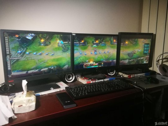 物理开图——三屏玩《英雄联盟》 先说个技术含量低的让大家先做个心理准备。玩过LOL的都知道,视野宽是非常占优势的。当初LOL的辅助盒子就曾装载拉远视距功能,后来被腾讯认为不公平,封禁了盒子。 不过这都不是事儿。因为如果你用三屏设置来玩LOL,你就会发现原来还有这样的开图方式! 在三屏情况下,你可以轻易看到比别人多两个屏幕的视野。而在地图上的视野框也是长长的一条,不知道官方看到后作何感想……