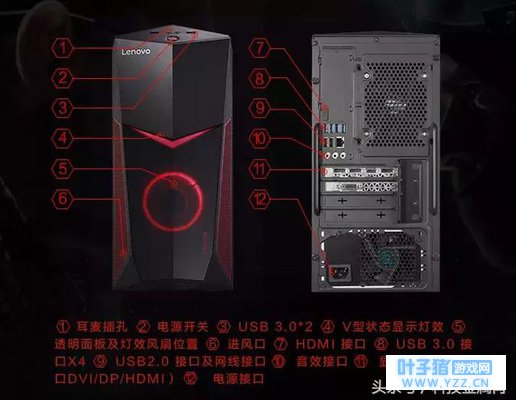 游戏市场的火爆,无疑给了各厂商一个新的思路,联想电脑公司为游戏用户专门推出了一个全新的系列:联想(Lenovo)拯救者 刃系列,这个系列延续了联想一贯的好品质,配上超高性能的配置,如今该系列中最受用户喜爱的无疑就是联想拯救者 刃9000 吃鸡游戏台式电脑主机了,这款游戏主机强大的配置可以带动市面上各种主流的大型游戏,在Intel第八代酷睿处理器发布后,刃系列也随之推出了新品拯救者刃9000,目前在售多款配置,适合不同的用户需求,按配置不同分成畅玩版、超神版和钛金版。介绍这么快,是不是有些难以消化,听我来慢慢为你道来。 炫酷外形惹人爱 拯救者刃9000采用了和上代刃7000基本相同的“碳纤铠甲风格”外观,配合多切角的棱角设计,炫酷的V型红色装饰灯带 ,整机充满了浓浓的科技色彩,还能营造激烈的游戏氛围。前面板光驱盖和半透明风扇窗都为盾形设计,正面和顶部的两侧边有一些碳纤维式样的装饰。