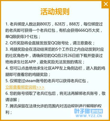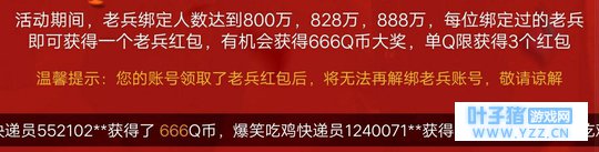 活动参与地址: 腾讯绝地求生官网首页>资讯中心>国服老兵感恩红包 每天666个666Q币贺新年 特别注意:一旦领取了红包可就没办法解绑了哦!