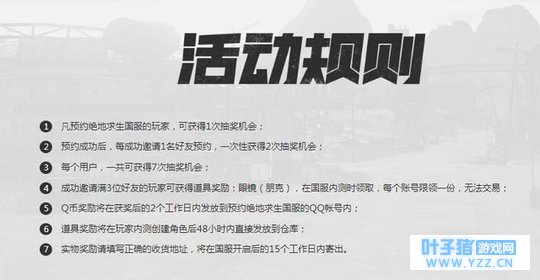 【活动奖励】 : 【黑寡妇蜘蛛幻影V2机械键盘】——炫彩灯光,灵敏无冲按键,绝佳手感让操作更顺滑! 【罗技G533&G433电竞耳机】——听声辨位、团队指挥,它们是你最好的帮手! 【雷蛇 巴塞利斯蛇游戏鼠标】——精准移动不掉帧,炫酷造型彰显华丽枪法! 【英伟达GeForceGTX 1060 6G显卡】——流畅吃鸡不卡顿,画质提升可不止一个档次! 除了以上的礼品外,所有邀请三位好友预约国服的玩家,均可免费领取《绝地求生》国服稀有装扮【眼镜(朋克)】
