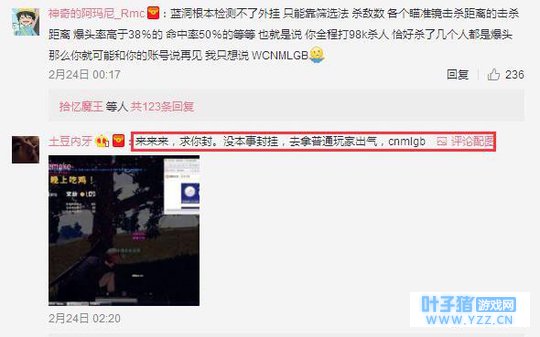 其中一个热门评论,便是这位开挂玩家的战绩图,他嚣张地说:“来来来,求你封!没本事封挂,去拿普通玩家出气,CNMLGB!”。