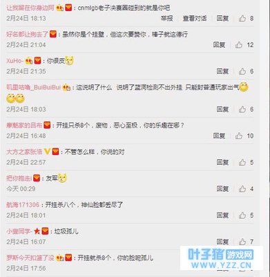 “CNMLGB,老子决赛圈碰到的就是你吧!”、“这所说明了什么?蓝洞检测不出外挂,只能封普通玩家!”、“开挂只杀了8个,废物,恶心至极,你的乐趣在哪里?”、“开挂只杀8个,神仙脸都丢尽了!”。