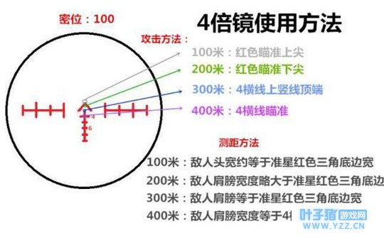 绝地求生里枪械在射击过程中不得不考虑后座以及抛物线下落的实际情况,如上图展示。而测量敌人距离的方法有很多,大D今天主要和各位基友讨论下“肩宽测量法”,以最常用的四倍镜举例。
