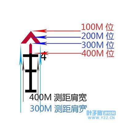 当红色三角形的底边的宽=敌人的肩宽时,敌人的位置处于300米。第一条横线(标有数字4)的宽=敌人的肩宽时,敌人的位置处于400米。如果这个看不懂,那么我们放大来看看。