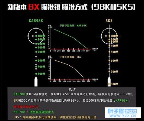 在选择准心的时候也是同理,300米时的准心就使用第一条红色竖线的顶端,400米的时候就是使用第一条黑横线与红线的交叉点,依此类推。 下面大D给各位鸡友大大附赠新版本8倍镜的解析图,大佬们看仔细哦~