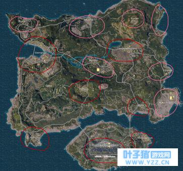 以上就是海岛图的全景,从上到下、从左到右边,地区名称分别为Z城、s城、光明顶、G港、R城 、学校、寝室楼、Y城、P城、P港、M城、小电厂和大电厂、机场以及N港。以上这些就是海岛图主要资源分布地区,其中小编用大红色标注的地区则是整张地图所刷资源最多的地方,运气好的话可能刷出4个三级头或者4把98K,粉红色则是一般资源刷新点,虽然不如红色那么富有,但是养活4个人还是绰绰有余的。比如上次小编跳的P港,那一次就真的富有,以至于资源背包都背不动了。