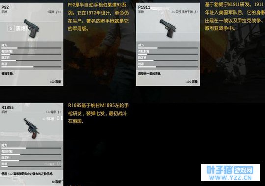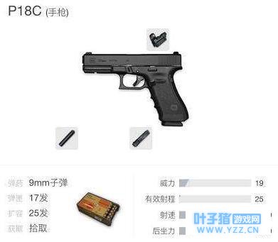 一下去就要面对战斗,新手们在前期应该首先学会保命,后面等熟悉这个游戏之后可以尝试组队一起下去。当然如果你觉得你枪很刚,或者你有把握一下就能捡到好枪能击杀其他玩家的话,你也可以跳这些地方,这些地方可以很大程度提高你的枪法和意识。 二.全装备介绍 说完了地图之后,小编下面就给新手们介绍一下绝地求生这个游戏所出现的一些装备和各种枪械的伤害。 首先是手枪和冲锋枪,可能很多人都觉得手枪很鸡肋,但是小编觉得在开头有一把手枪还是不错的,总比赤手空拳去打人好吧。尤其像P18c这把自动手枪,加上扩容弹夹之后变成25发备弹,近距离一波扫,就算对方拿的是长枪鹿死谁手还不一定呢! 1. 手枪