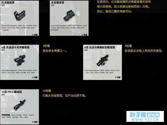 最后小编就给大家介绍一下枪械的配件了,说道配件就不得不先说瞄准镜了,瞄准镜会给枪械很好的辅助,不管是近战还是远距离交火,如果没有这些瞄准镜,我相信你能打中敌人真的是看运气了。还有就是除了15倍镜是空头品之外其他的都可以在游戏里面找到,但是8倍的话那也是看人品了,有时候可能一大片建筑物群都不会出现,但有时候可能路边厕所就有一个。另外新版本更新之后,8倍镜不能在装载M16A4这把步枪上了,新手们一定要注意。 13. 枪托与枪口
