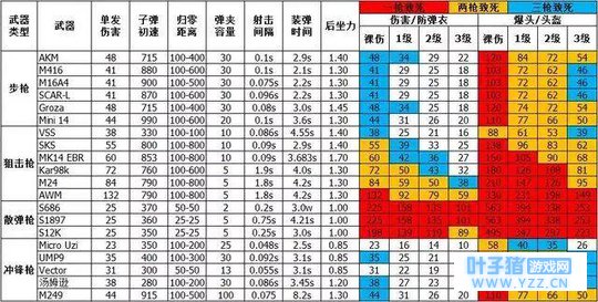 以上就是整个绝地求生所出现的主要装备了,当然还有一些其他的装备小编这就不细细说明了。下面给新手们再提供一张枪械伤害图,有助于你们在战斗时能够知道敌人大概还需要几枪就能倒地或者告诉队友们如何补枪。 三.海岛图攻略 介绍完了地图和装备,相信你们也应该基本了解这个游戏了,下面小编就给新手们讲一下如何玩好这张海岛图。第一,选择跳伞的地点非常重要,小编在上面也已经说了很清楚,不建议新手们一开始就跳那些会战斗、资源多的地方,不然说不定就是落地成盒了。