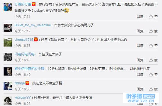 官方数据 虽然首次出现负增长是在中国的过年假期和寒假假期,但是绝地求生出现负增长也不是没有其他的原因的,大多数矛头都指向蓝洞的不作为 对游戏外挂的打击力度不大,在过年期间很多玩家5局总会碰到2局里面有玩家使用外挂的情况,没办法持续游戏。除此之外一批类似的游戏开始逐渐出现,都在拉扯玩家走向,包括手机端游戏的出现都在稀释流量。下面看看玩家朋友的分析吧。