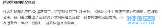 还有就是跨运营商网络全互联和首次开启下载不限速,这两项在以往腾讯的游戏里几乎是从来没有的。首先是网络运营商,之前想玩游戏基本要选择电信或者联通。至于移动,超高的延迟会让玩家抓狂的。而国服这次实现跨运营商网络全互联,这一波大手笔让大家不需要费心去特意选择宽带了,避免了家里网络不行去网吧玩的情况。