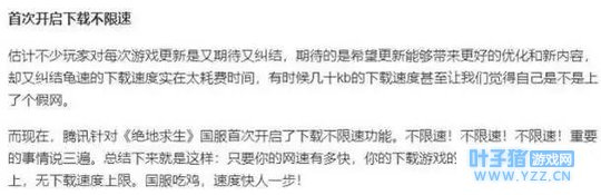 而下载不限速,这项技术大家应该在STEAM和暴雪战网上体验过,你的带宽有多块,下载速度就有多快。对于百兆用户,吃鸡十多G的客户端只需半小时就可轻松下载完成。这项服务对于腾讯来说是第一次,以前考虑到服务器带宽的问题,下载器往往是进行了限速,只对一些VIP玩家开启了不限速,而这次所有玩家都将能享受到这一待遇,这也能看出国服满满的诚意。