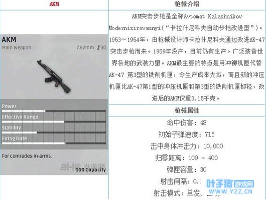 子弹初射速为715,伤害为身体48,头部120,肢体25。 单点和全自动两种射击模式,弹容量30发加上扩容40发,高伤害以弥补了其在射速上的不足。 有的人觉得AKM的伤害较高,所以就有部分玩家给AKM装备倍镜当做狙击枪使用。 其实这个行为非常不可取,AKM弹道不稳、初射速较低,打中远距离的敌人效果非常差,伤害上比不过sks和mk14这种连狙,射击效率远低于5.56子弹的枪,除非是迫不得已的情况下,不建议这样做。