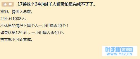 作为高素质吃瓜群众,有网友计算了下,在双排情况下 24小时1000人,不吃不喝不休息,一小时得完成20次击杀,如果休息12个小时,一小时要完成40次,所以这根本就不可能嘛,就算可以完成,这么高强度的挑战,不怕猝死嘛。