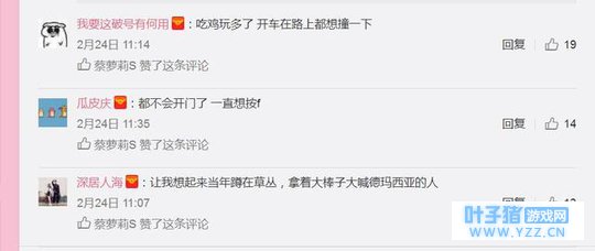 这条微博迅速激起了粉丝们的戏感,在评论区各种骚思路:吃鸡玩多了真的"影响日常",出门不带头盔都没安全感,路上开车都想撞一下,开门都先找F键。还联想到了当年LOL最火时间时,拿着棍子蹲在路边草丛大喊德玛西亚的老梗。