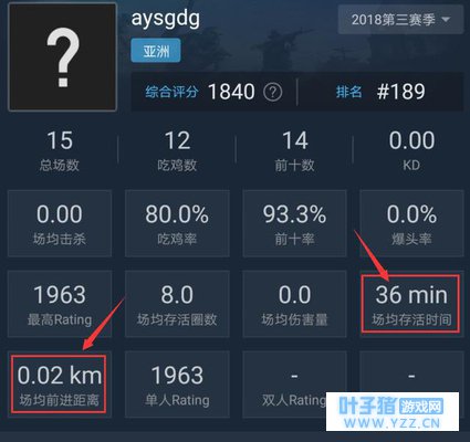 查了最后吃鸡玩家的ID之后发现,原来这个吃鸡的玩家开了一种新型外挂。从他的战绩可以看出,他的场均前进距离仅有0.02KM,相当于落地就在挂机,然而存活时间却达到了36分钟。更夸张的是这位玩家的 吃鸡率达到了惊人的80%,玩了15局就吃了12局鸡,而且是亚服顶尖分段 。