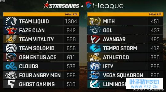 Liquid战队三连鸡霸占榜首优势明显,中国战队4AM、GOL、IFTY分列7、10、14名。