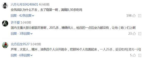 网友们纷纷调侃,让全民战队和中国的主播上场一定能吃上鸡,毕竟在国内有些主播的实力简直能用神仙来形容, 20 多杀,还能精确找人,神级技术压枪,英雄联盟的主播转型吃鸡玩的超神的这么多,怎么也要到国际赛上露露脸才比较吊。