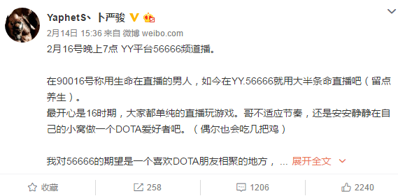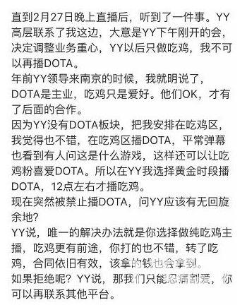 本来这种直播模式也是提前与yy直播沟通好的,但不料yy高层却忽然联系到他,并且通知他以后只能播《绝地求生》,必须放弃DOTA,YY表示,Pis要么以后选择做纯吃鸡的主播,要么就只能自行联系其他直播平台,于是便有了以下这条微博。