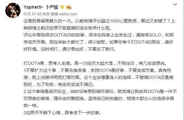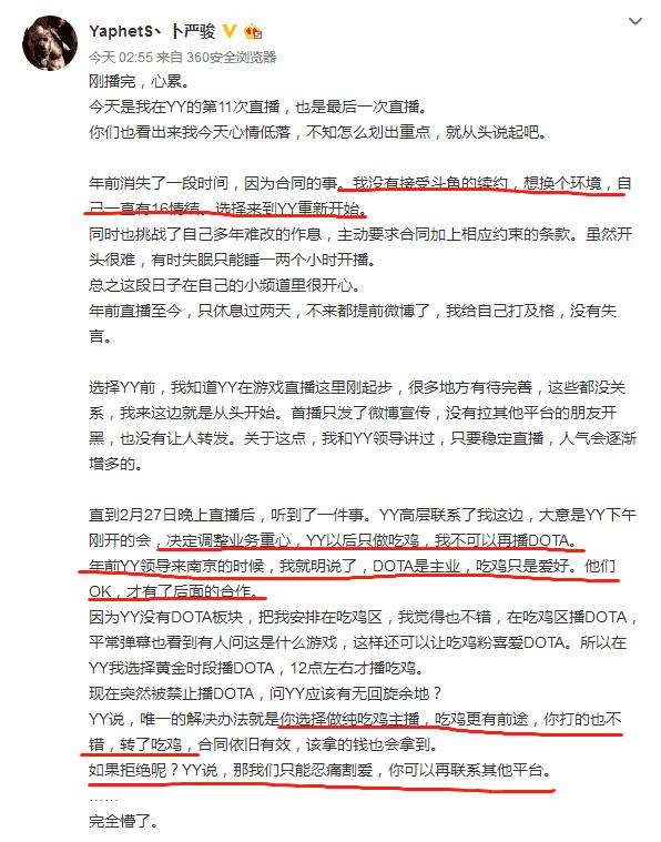 从pis深夜发出的微博来看,矛盾很简单。就是YY想让pis只播吃鸡,放弃dota!而pis方面则称是不可能放弃dota的,并且怼了YY出尔反尔!