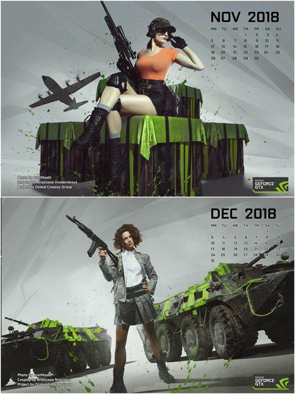 这套日历中,每一个人物所拿的武器都不相同。同时人物后面的装甲车、飞机、摩托等等完美地烘托出了“吃鸡”的氛围,同时我们不难发现的是,每一张日历的主要色调都是以绿色为主,这显然是英伟达有意而为之的,因为英伟达的代表颜色就是绿色啊。