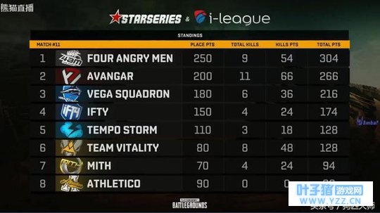 3月3正赛第1局击杀榜 此时场上总共有4支队伍,其中有两支中国队伍,很有可能吃鸡。而AVANGAR满编且位置较好,其他三个队伍互架,短兵相接。4AM在废墟最高处,占据最佳位置,这时候AVANGAR与VEGA交火,韦神击杀掉VEGA,4AM成功吃鸡。